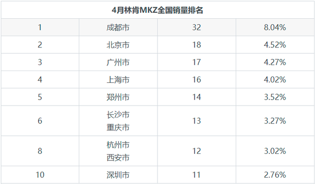 4月林肯mkz全国销量分布情况,成都市占比8.04%