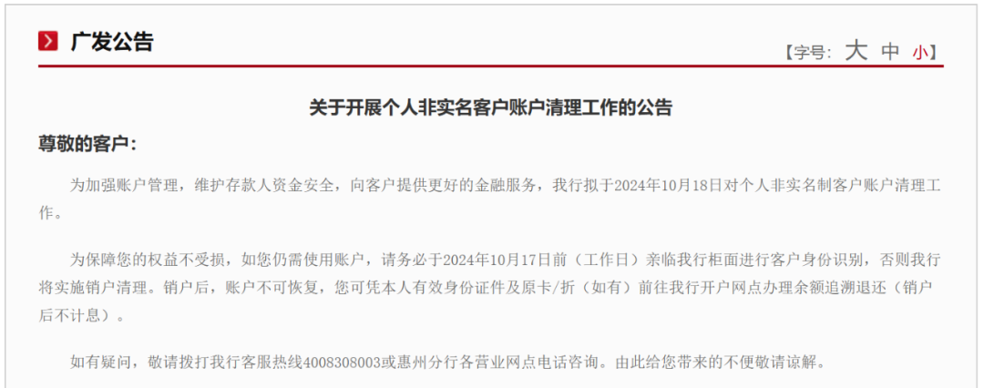 无独有偶,10月15日,广发银行也发布《关于开展个人非实名客户账户清理工作的公告》显示,为加强账户管理,维护存款人资金安全,向客户提供更好的金融服务,该行拟于2024年10月18日对个人非实名制客户账户开展清理工作。