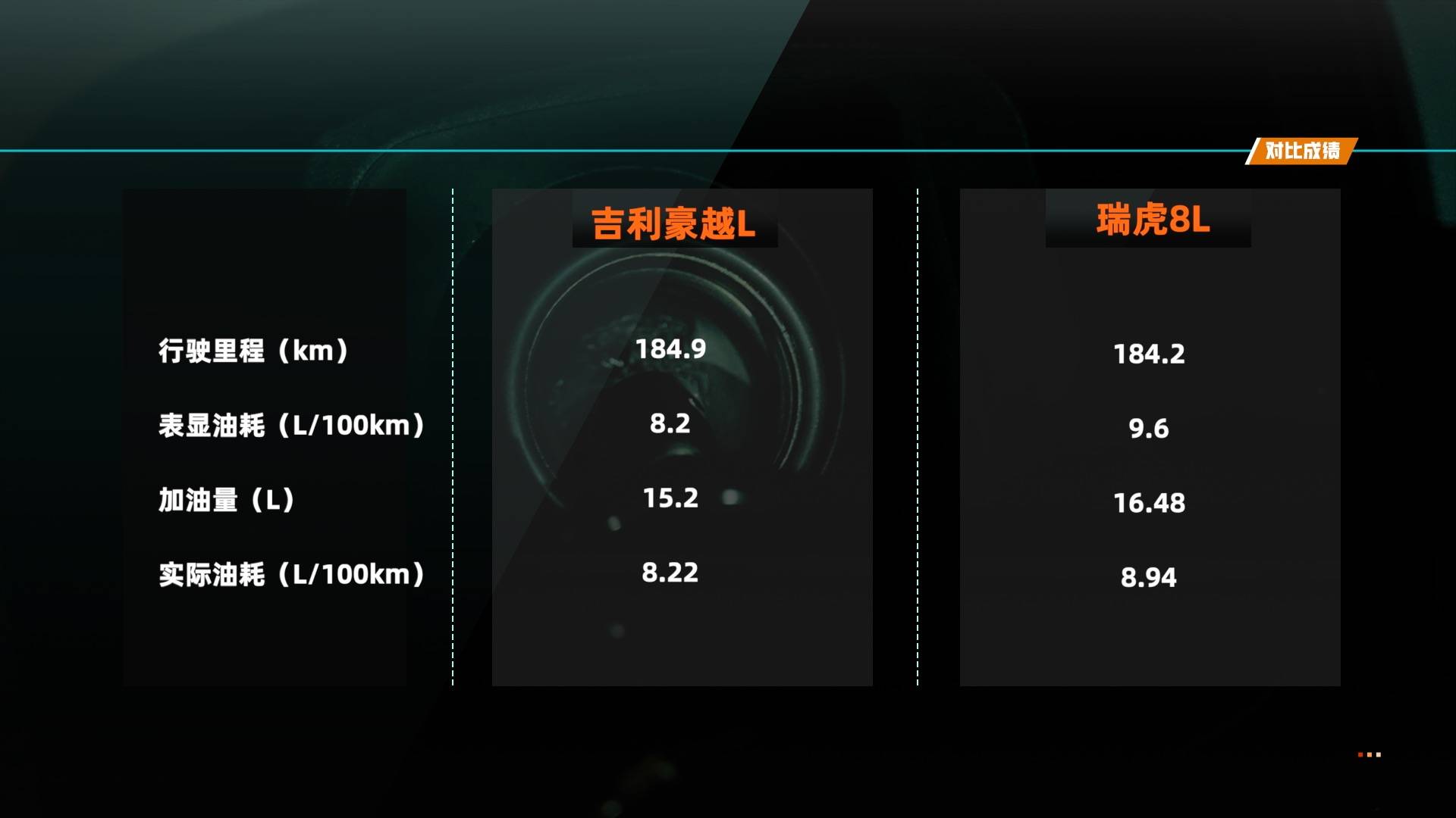 经过我们的实际测试,豪越l在表显行驶了184.9km、表显油耗8.2l/100 km的情况下,实际油耗8.22l/100 km,还是比较准的。而瑞虎8l在表显行驶了184.2km、表显油耗9.6l/100 km的情况下,实际油耗8.94l/100km,属于是反向虚标。从整备质量上来看,瑞虎8l的1785kg,确实会比豪越l的1730kg重出55kg,多出一个成年人的体重,但两台2.0t动力系统的油耗都在合理范围内。