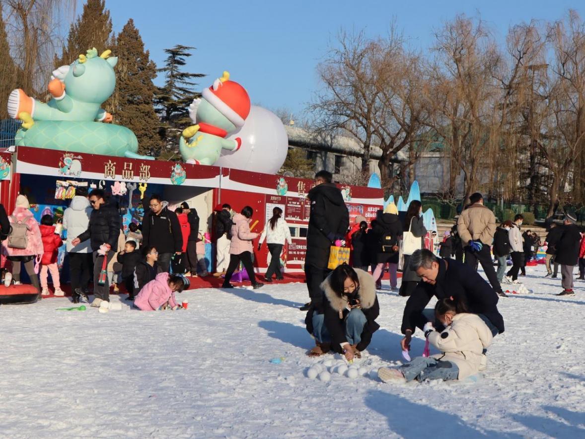 走进龙潭公园北门,只见银白的“雪被”覆盖北侧湖面,游客仿佛置身童话般的冰雪世界。卡通龙玩偶、龙气球和冰雕吸引不少小朋友拍照留念,乐园里不少龙年元素装点出喜气洋洋的节日氛围。