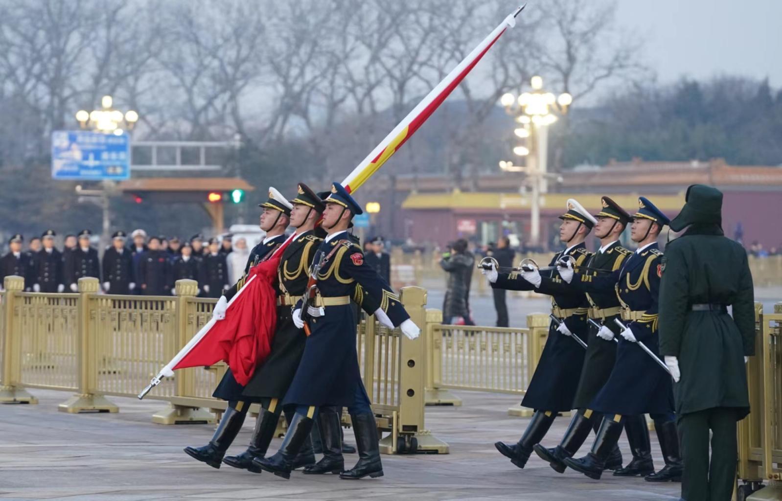 7时36分,“向国旗——敬礼!”伴随着响亮的口令,护旗队员和礼兵行礼,礼号手奏响《义勇军进行曲》。迎着新一年的曙光,升旗手高高扬起国旗,鲜艳的五星红旗迎风招展,在庄严的国歌声中缓缓升起。这一刻,市民的脸上洋溢着幸福和欢乐,写满了骄傲和自豪,大家自发齐唱国歌,嘹亮的歌声响彻整个广场。