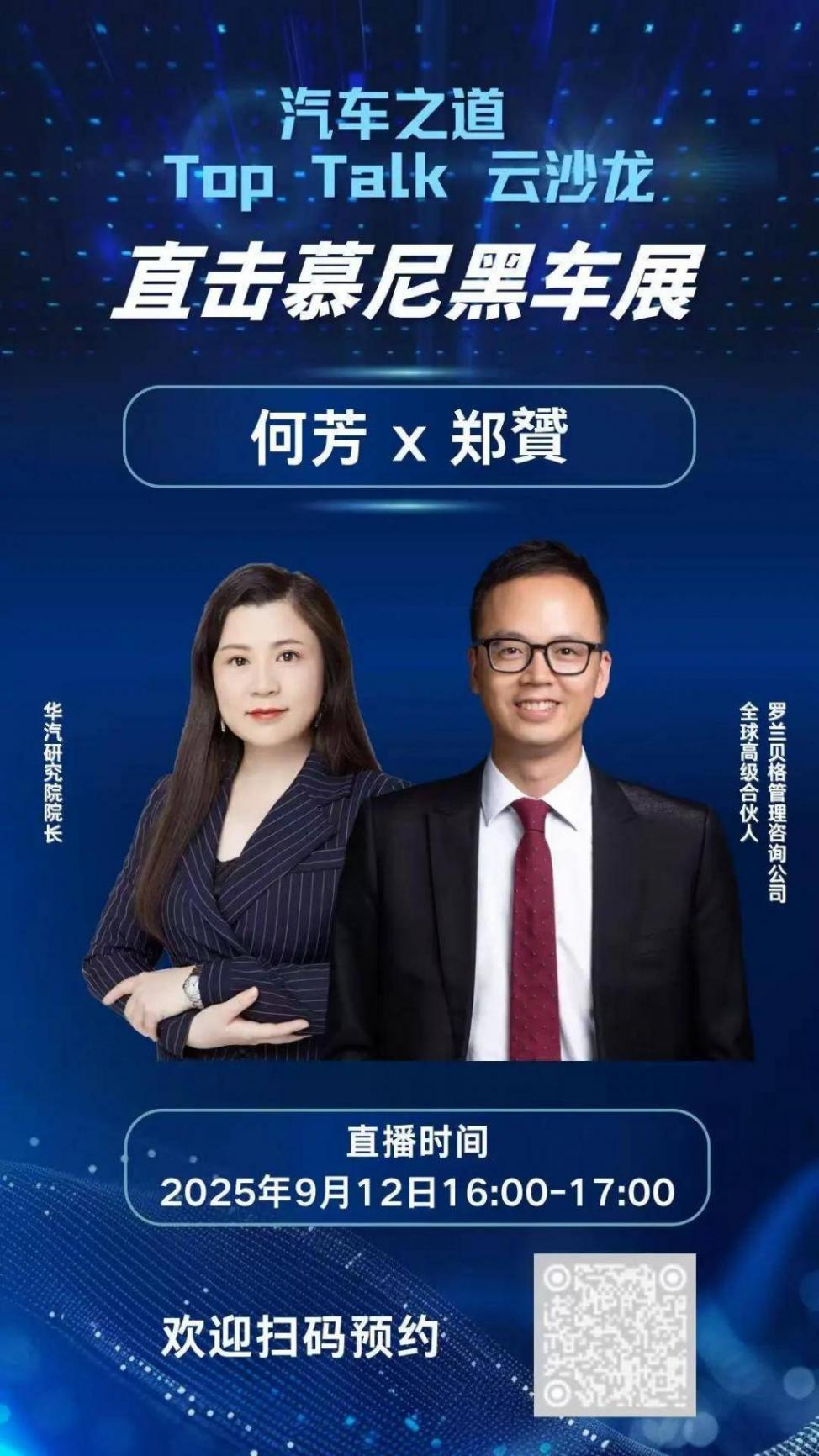 以慕尼黑车展为契机,9月12日,华汽研究院院长何芳对话刚刚从慕尼黑考察归来的罗兰贝格全球高级合伙人、亚洲区汽车业务负责人郑赟,在本期《汽车之道》top talk “云沙龙”中,紧扣“中国突围、技术革命、产业变革、全球化出海”主线深入交流,共同探讨行业未来走向。