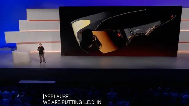 扎克伯格还没进场时,就戴上这款眼镜高调演示音乐播放等功能,走进发布会现场后,却又卖了个关子,把它放在一侧,足足讲了近20分钟,才正式揭晓。