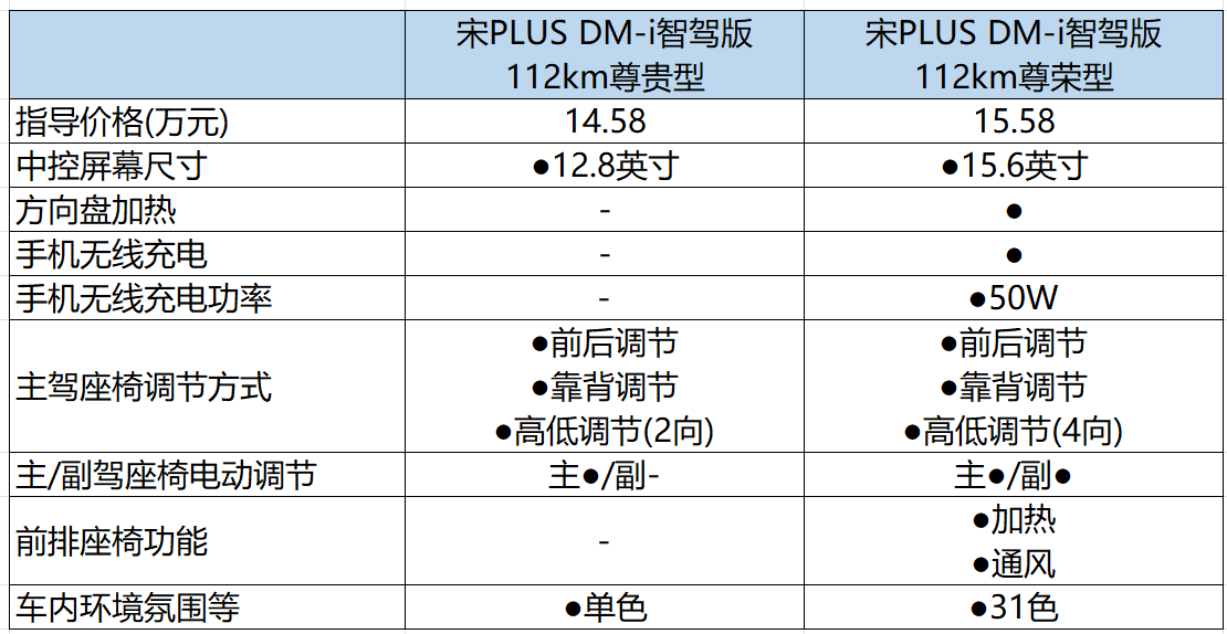 宋plus dm-i智驾版112km尊贵型售价14.58万,价格贵了1万元,纯电续航升级到了112km,另外还增加了26kw快充,9扬声器和单色氛围灯。