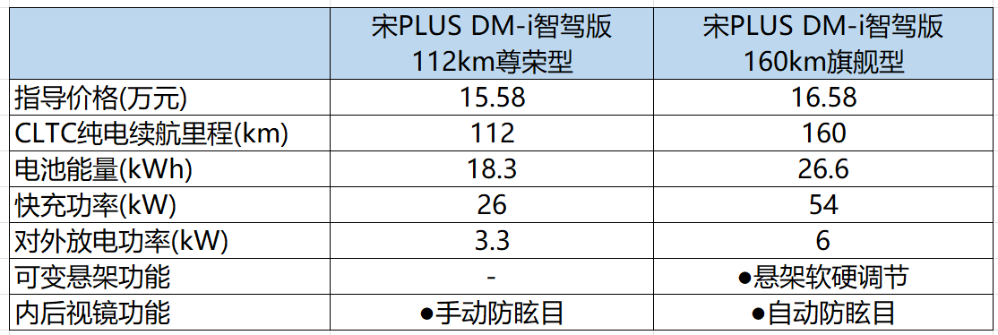 宋plus dm-i 智驾版160km旗舰型售价16.58万,价格又贵了1万元。电池容量提升到26.6kwh,纯电续航里程达到160km,并搭载fsd频率可变阻尼减振器,vtol移动电站最大功率提升至6kw,配备54kw直流充电口,还增加了自动防眩目内后视镜、led动态迎宾灯、金属迎宾踏板等。