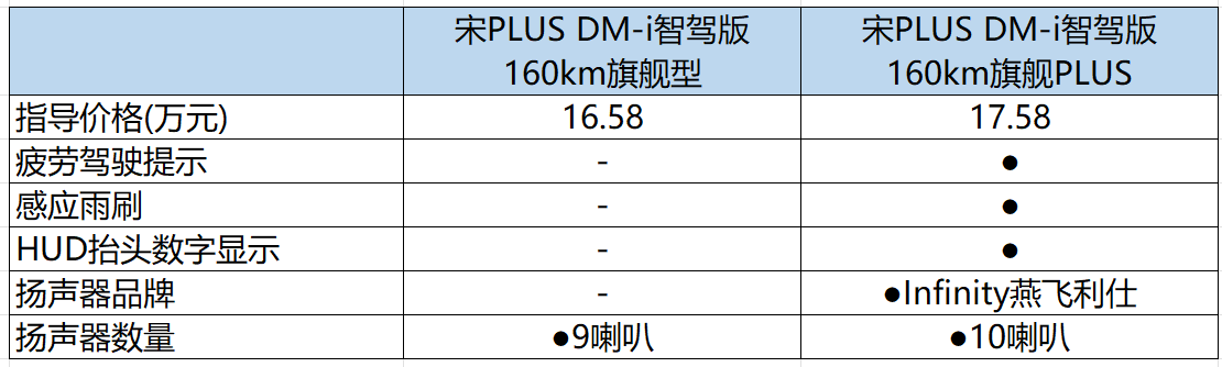 最后是宋plus dm-i 智驾版160km旗舰plus售价17.58万,价格还是增加1万元。这一配置加入了感应雨刷、w-hud抬头显示、驾驶员疲劳监测,并采用infinity品牌音响,扬声器数量升级到10个。