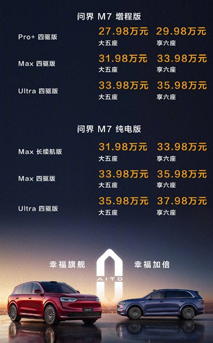 从pro到max,大家看出来没有?买的没有卖的精,算来算去,其实是取舍,你更喜欢华为的ads,还是理想的软沙发?至于经济账,没有选哪个就更划算和绝对的省。不过有一点是确定的,问界新m7的价格,没有定贵,如果你要买5米 大五座,或三排六座新能源suv,它和理想l7的价值感接近,而情绪价值就比较主观,看个人喜好,另外它还提供了理想l系没有的纯电版。
