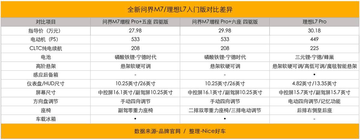 直接对手理想l7这边,入门价30.18万,同样提供仅支持高快领航的辅助驾驶,比全新问界m7高了2.2万元。比比其他条件,全新问界m7动力更强,纯电续航问界m7 pro cltc标208公里,理想l7 pro智能焕新版标225公里,都有全车电吸门、支持放电功能,两车都是双电机四驱,前双叉臂后多连杆悬架结构,甚至连轮圈都是同样标配20英寸。