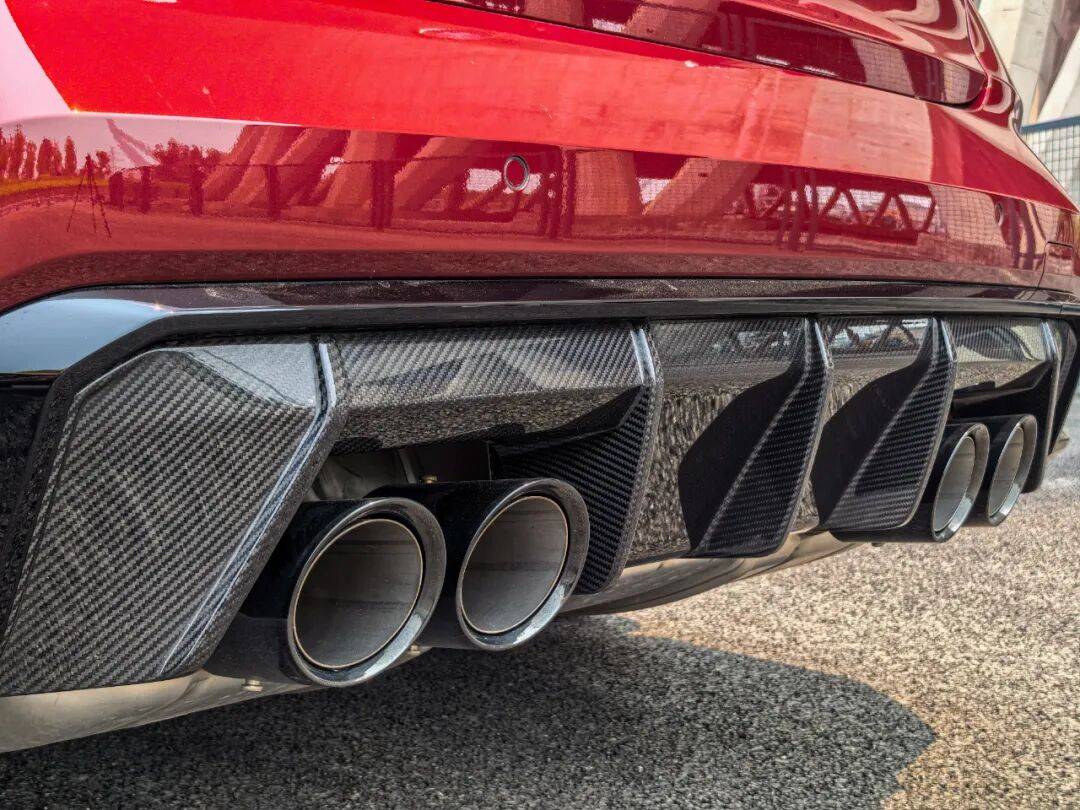 车尾的宽体看起来更加明显,四出排气搭配碳纤维的尾翼和后扩散器,让后车也能清楚地知道这是一个狠角色。