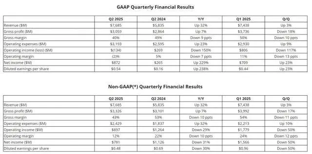amd虽与英伟达尚有差距,但amd势头正盛。根据相关财报数据显示,amd在2025年第二季度营收为76.85亿美元,较上年同期的58.35亿美元增长32%,较上一季度的74.38亿美元增长3%。