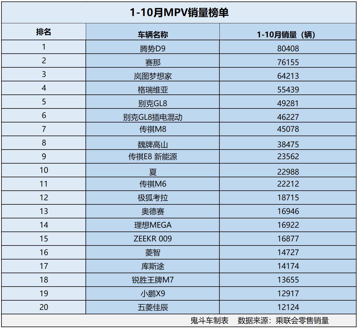 市场看着热闹,新车与老款车型之间竞争升级,但这一细分市场销量表现很一般。日前,乘联会发布1-10月零售销量数据,鬼哥整理出1-10月mpv市场销量排名前二十榜单,结果,鬼哥发现,整个榜单上没有一款车型1-10月累计零售销量达到10万辆。接下来,看看具体车型排名?
