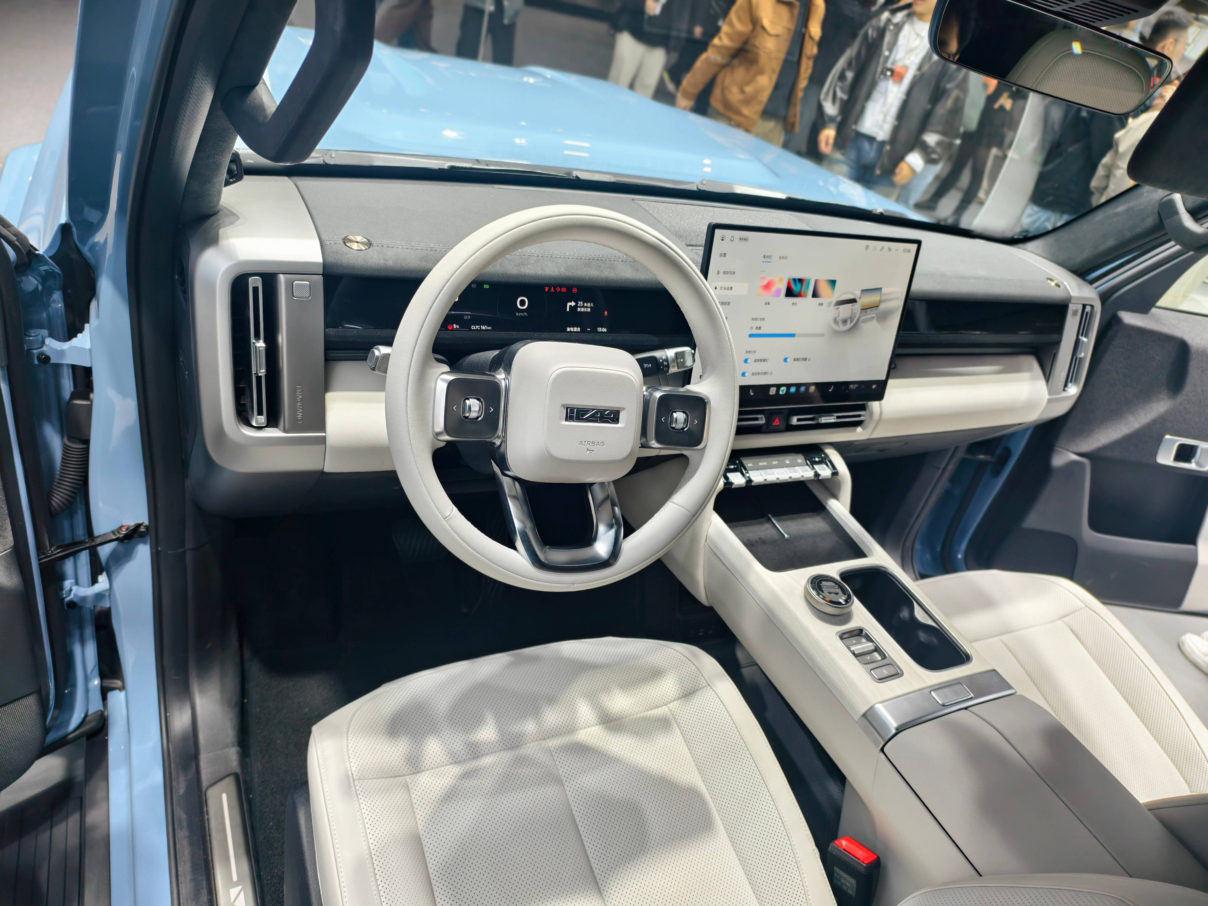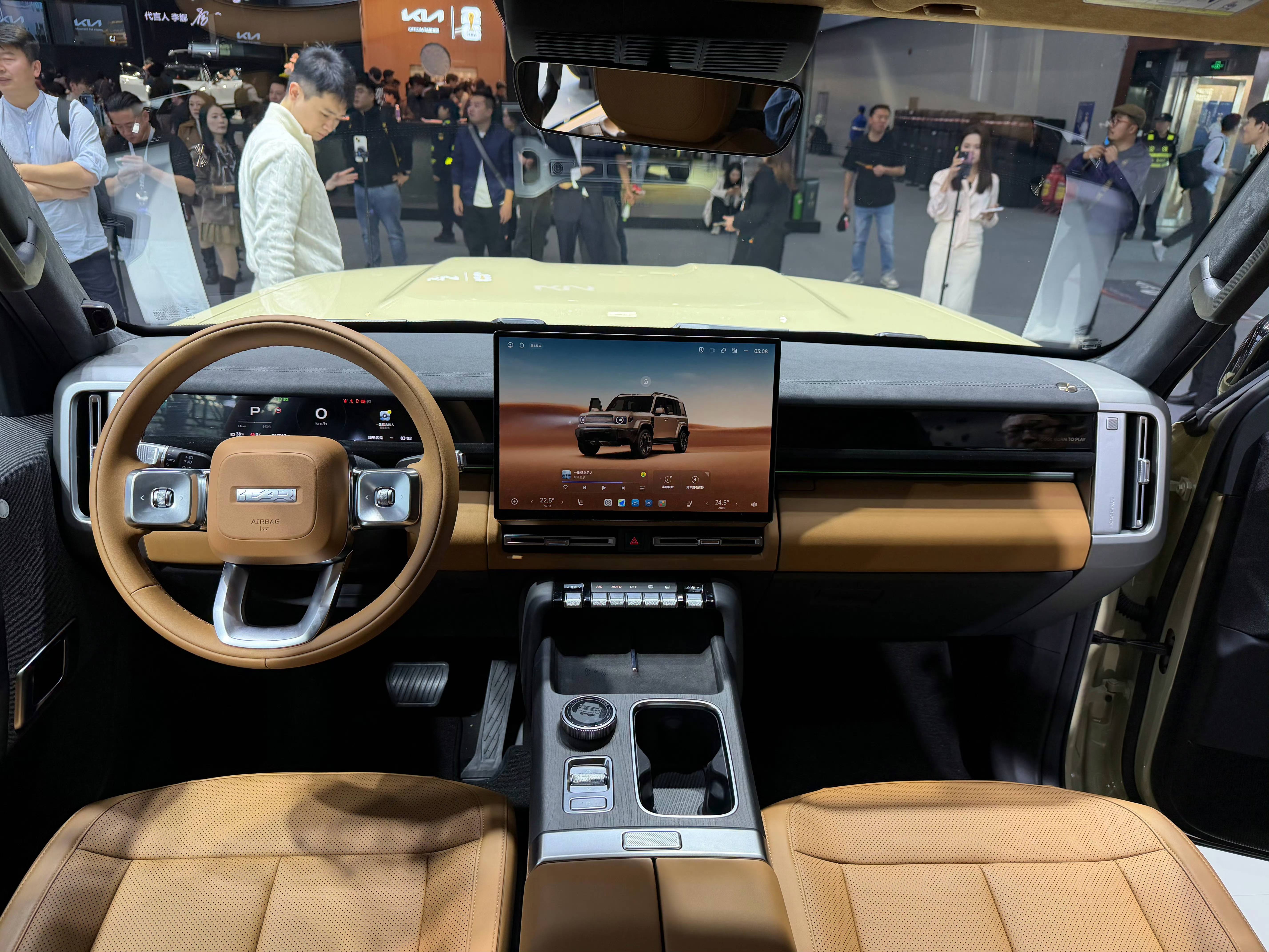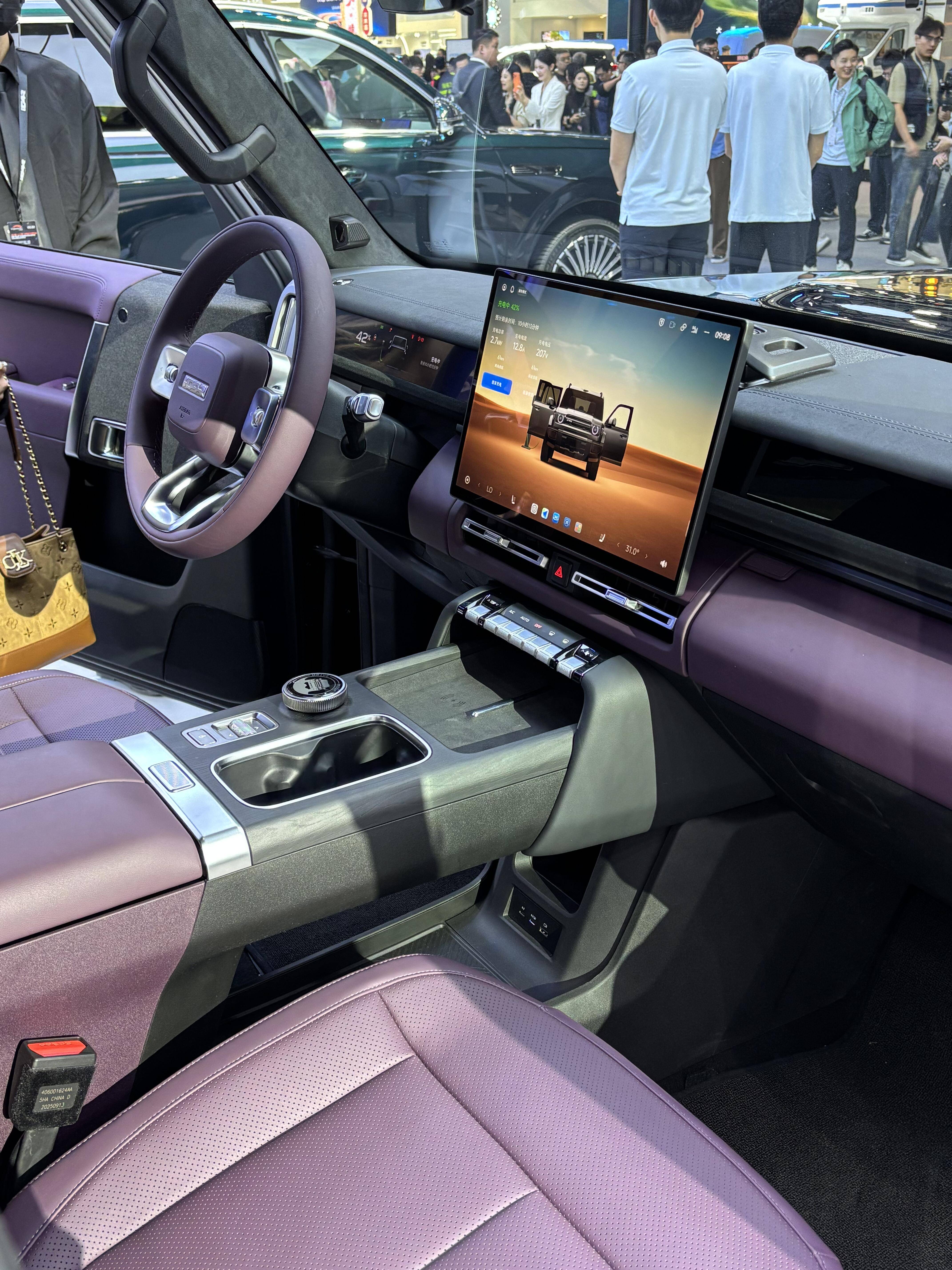 内饰也有棕色、白色、紫色、黑色等多种风格,多层次感的中控台与硬派外观相得益彰,并延续了家族化的内嵌式矩形仪表屏和15.4英寸悬浮式中控大屏,并搭载8295p座舱芯片。而大量皮质包覆,配合木纹饰板/镀铬饰件点缀,又带来了豪华气息,此外诸如多功能方向盘 电子怀挡、一排钢琴式物理按键、50w手机无线快充、控制旋钮以及氛围灯的加持,也进一步提升了档次感。