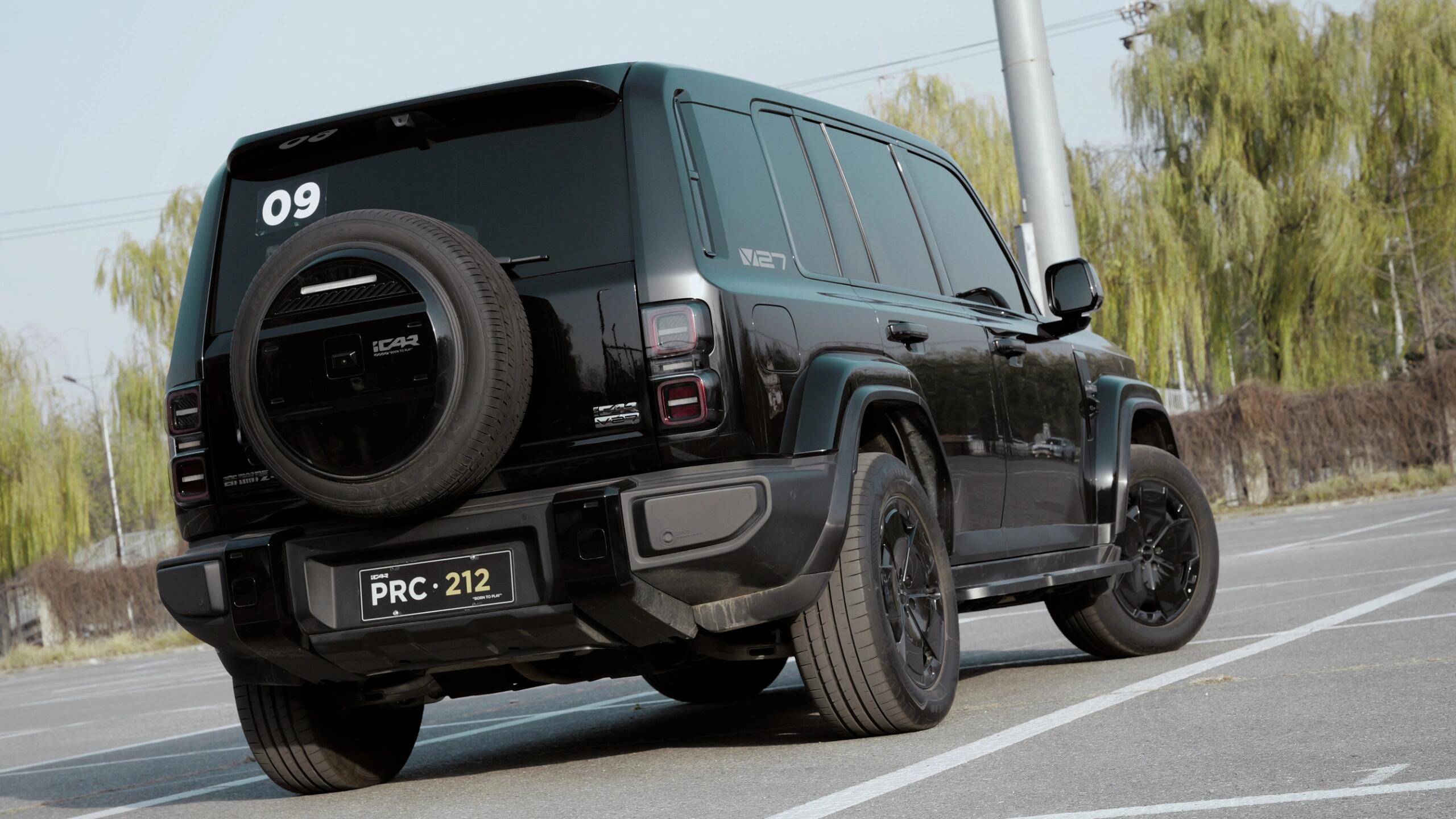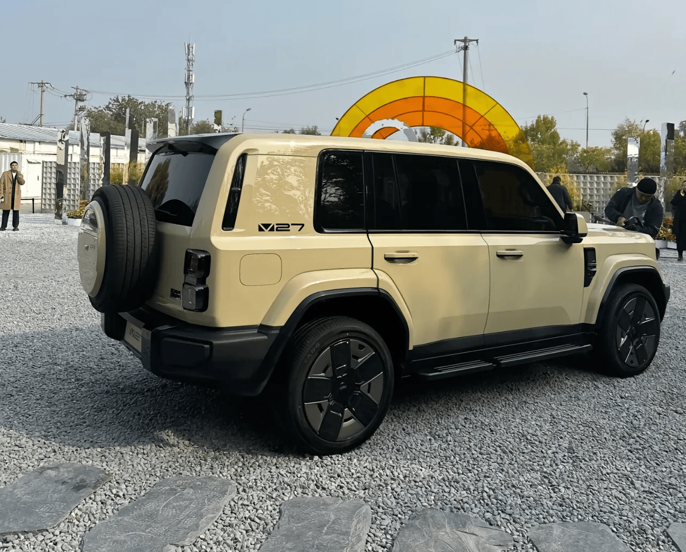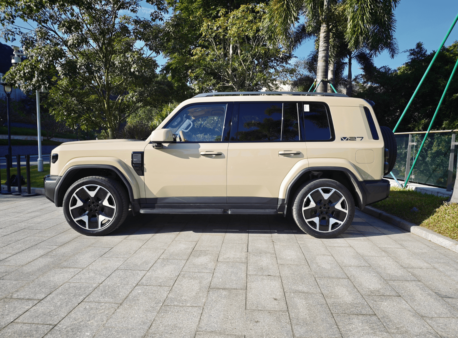 车身尺寸长宽高分别为5055(备胎版)/4909(小书包版)×1976×1855/1894(带车顶行李架)mm,轴距2910mm,相比钛7更大一些。车身侧面采用“方盒子”造型,加之棱角分明的宽体轮眉、固定式脚踏板等,硬汉气息显露无遗。同时d柱位置还将采用盲窗设计 v27标识,配合19/21英寸双色五辐式轮毂,继续强调潮流风格。