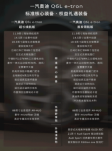 但如果拆解一下,会发现定位智能豪华的q6l e-tron,产品力也很强。它不仅标配就是满配,就算看硬核的参数,也都能做到同级第一——