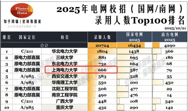 比如2025年,国家电网和南方电网加起来共录用了666人。从全国来看,这个录用人数比绝大多数985和211高校都要多。