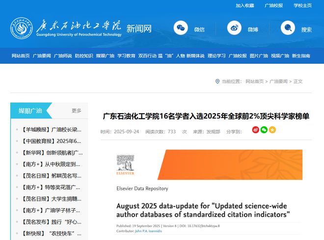 再往前看,斯坦福大学跟爱思唯尔共同公布的2025年全球前百分之二顶尖科学家名单上,广油有十六个人名字在列,这个入选人数和增长幅度,都打破了学校自己的记录。