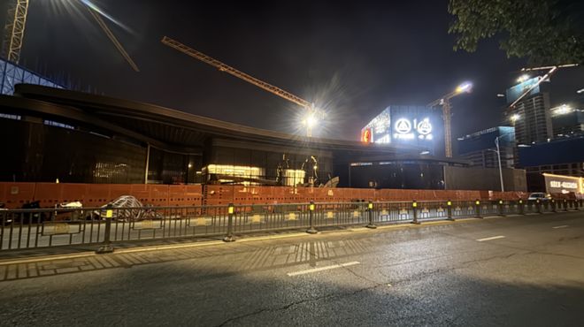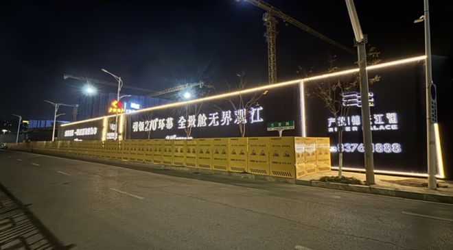 夜色中早已立起的蓝色围挡格外醒目,“头排瞰江,一线江河首序为尊”的标语直接锚定了项目的江景核心定位。