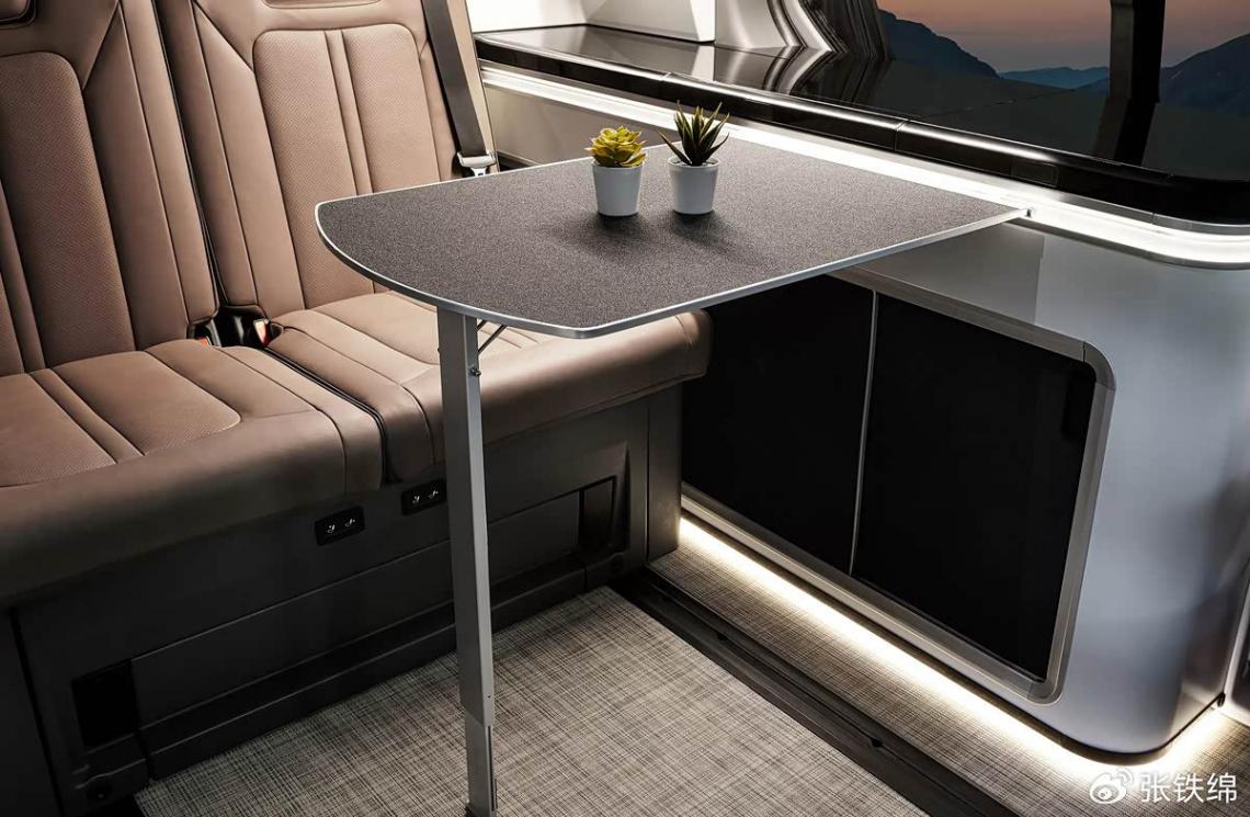 新车在橱柜位置还提供了折叠式的小桌板,打开之后能够形成吧台的效果,形成了客厅式的空间。
