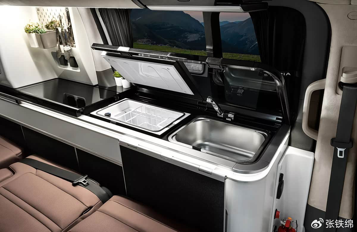 车内布局是一大亮点,车内一侧提供了厨房用具,包括了冰箱、洗菜盆等。