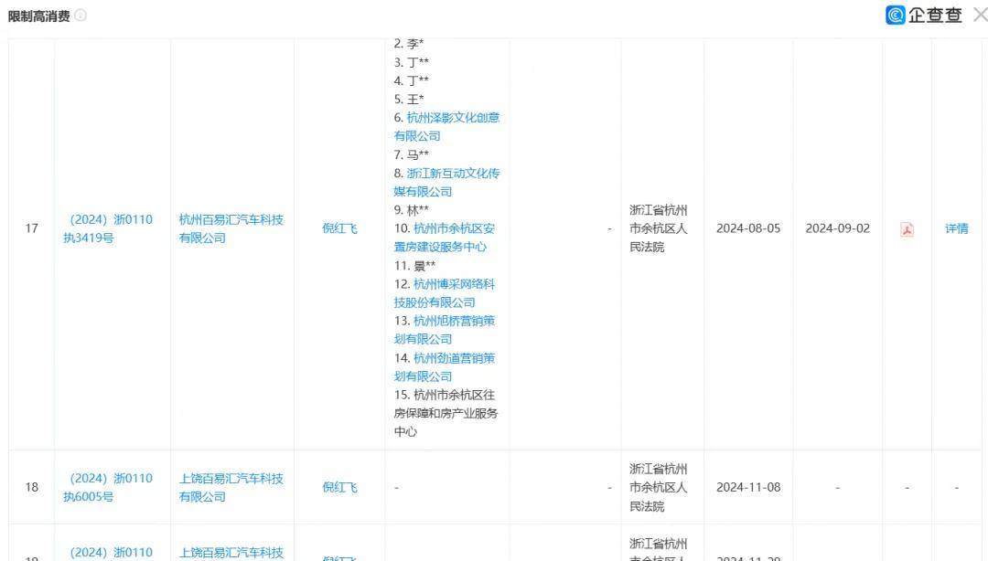 截至2025年7月,车配宝母公司上饶百易汇汽车科技有限公司已累计收到19条限制消费令,涉案金额达798万元。
