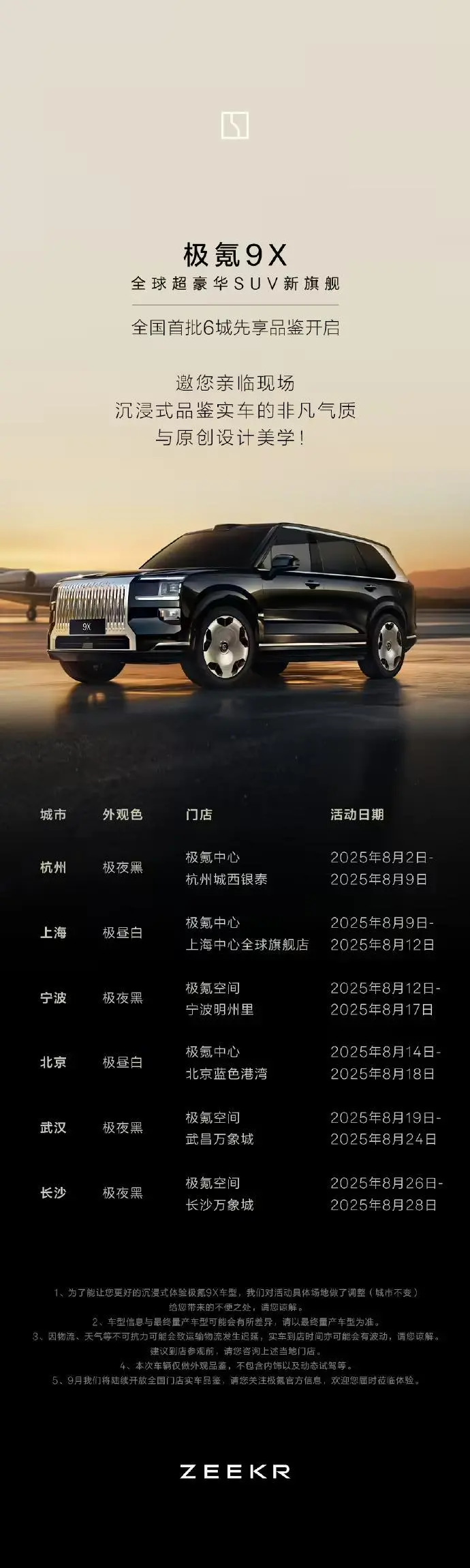 8 月 9 日消息,极氪汽车今日宣布,极氪 9x 全国首批 6 城先享品鉴开启。该车系极氪首款混动车型,将于月底成都车展预售。