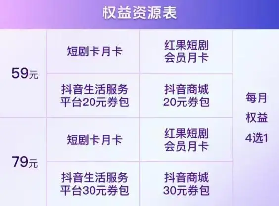 两档均有全国亲情网基础功能费减免及抖音热门权益 4 选 1:短剧会员卡月卡;红果短剧会员月卡;抖音商城 20/30 元券包;抖音生活服务平台 20/30 元券包。