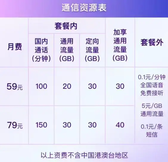其中,59 元档含 20gb 国内通用流量、100 分钟国内通话、30gb 定向流量等;79 元档含 30gb 国内通用流量、150 分钟国内通话、30gb 定向流量等,还有首充 50 元得 170 元活动。