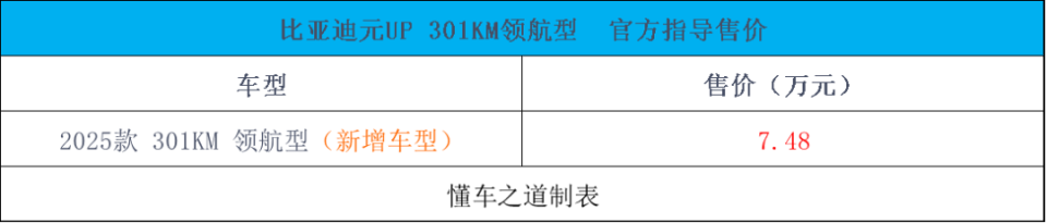 7月30日,在安徽合肥发布了元up 301km领航型,该车作为元up家族的全新入门车型,起售价进一步降低,为日常通勤用户带来更多实惠。元up 301km领航型共推出了1款车型,价格为7.48万元。