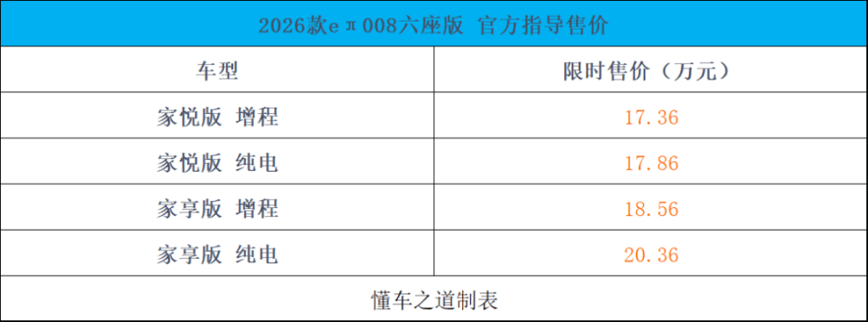 8月1日,2026款东风奕派eπ008六座版上市,供包含纯电和增程两种动力共计四款车型,限时先享价售价区间17.36-19.06万元。