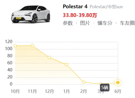 今年上半年,极星在国内一共只卖了69辆车。是的,你没看错,6个月卖了69辆。这其中有50多辆都是在今年1月份卖掉的,后面几个月都是个位数,甚至在4月、5月都查不到销量。