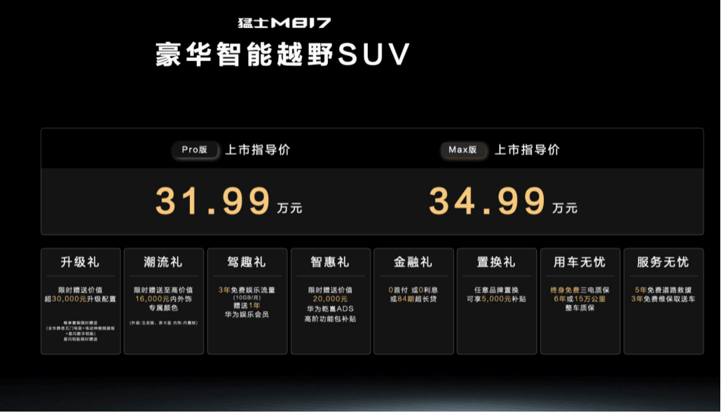 8月17日,东风猛士m817上市,共推出两个版本,售价分别为31.99万元和34.99万元。猛士m817是东风猛士科技与华为合作打造的一款硬派越野车型,采用非承载式车身结构,搭载华为乾崑ads 4智驾和鸿蒙座舱5,将越野车与智能化融为一体。