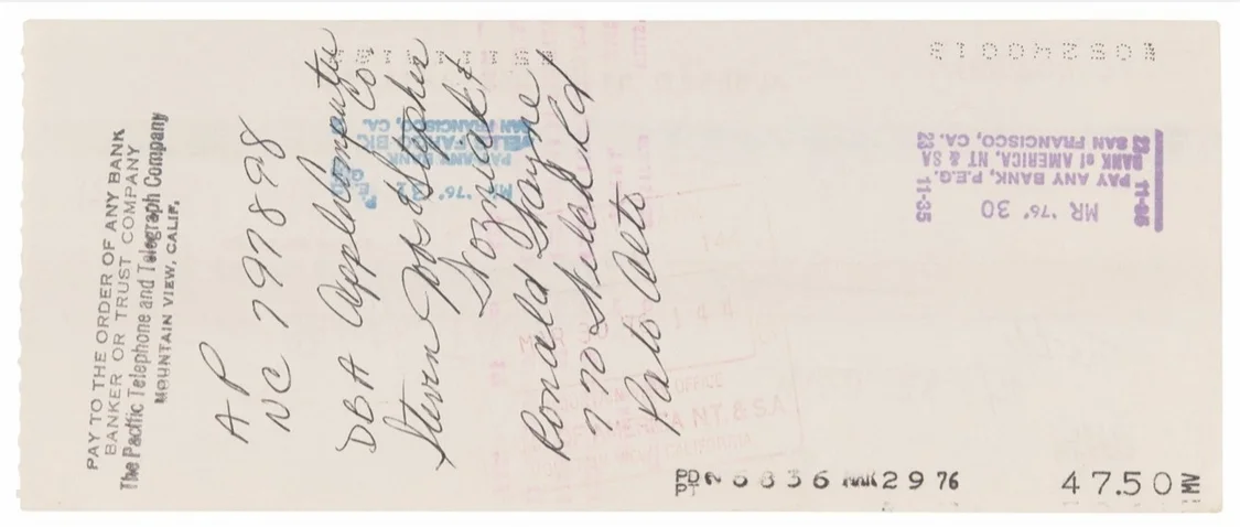 该支票于 1976 年 3 月 28 日由乔布斯填写并签署,支付给 pacific telephone,票面金额仅为 47.50 美元(it之家注:现汇率约合 340.7 元人民币)。