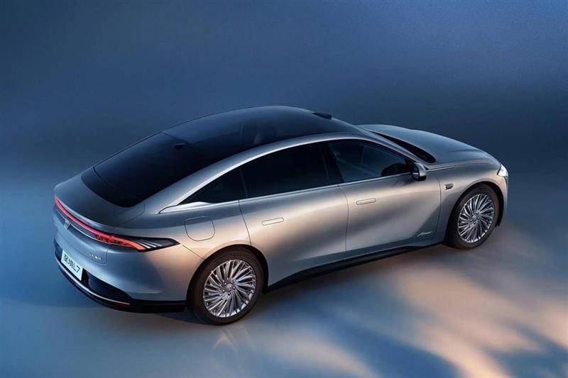 车身侧面可以看到溜背造型,整个车顶线条流畅自然地向后下滑,车窗的下沿采用了镀铬饰条进行装饰,营造出时尚且精致的视觉效果。尺寸方面,长宽高分别达到了5032/1952/1500毫米,轴距为3000毫米,定位中大型轿车,车内空间表现出色。此外,车侧还配备了隐藏式门把手和低风阻轮毂,有效降低风阻系数,提升续航表现。