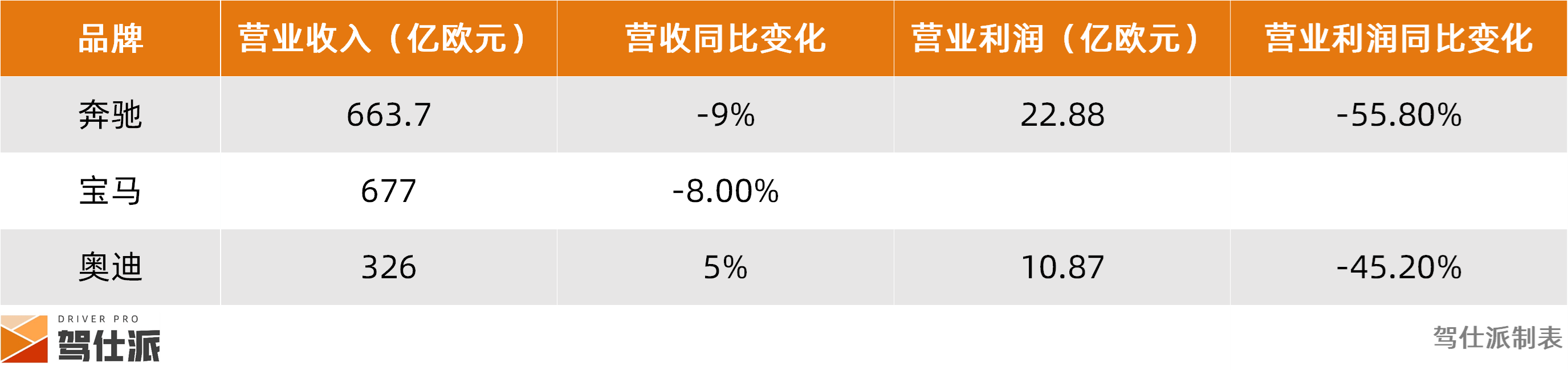 奔驰上半年营业收入663.7亿欧元,同比下降8.6%;营业利润与净利润均为26.88亿欧元,同比降幅高达55.8%,乘用车业务营业利润率为4.5%,利润收缩幅度最为显著。