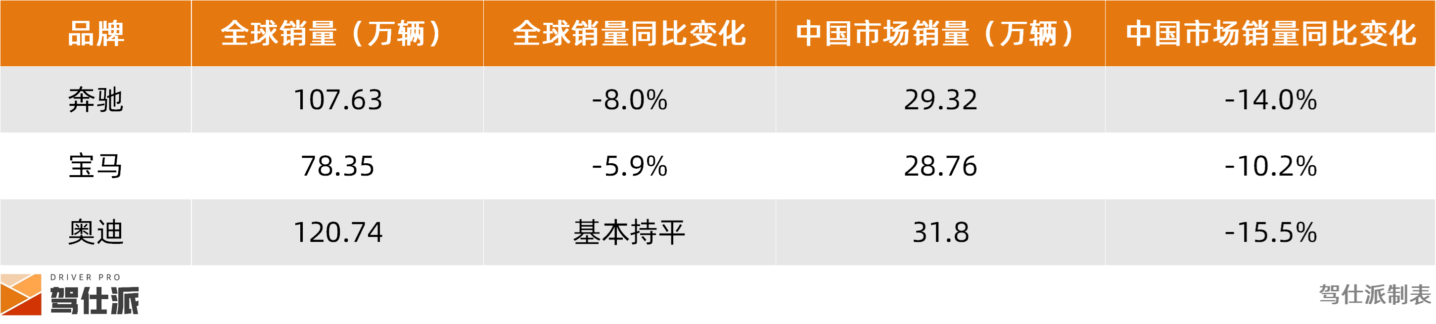 在全球销量方面,奔驰集团上半年销量107.63万辆,同比下滑8%;奥迪上半年交付新车78.35万辆,同比下滑5.9%;宝马上半年销量超120万辆,与去年基本持平。