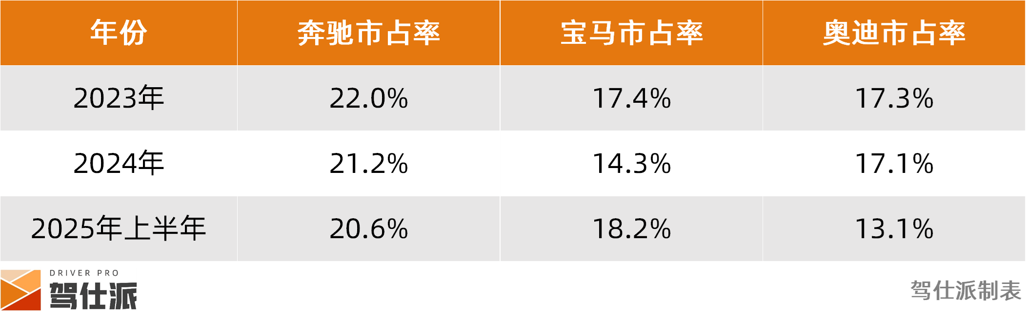 同比来看,2024年三家分别为:奔驰市占率21.2%、宝马市占率14.3%、奥迪市占率17.1%;2023年三家分别为:奔驰22.0%、宝马17.4%、奥迪17.3%。