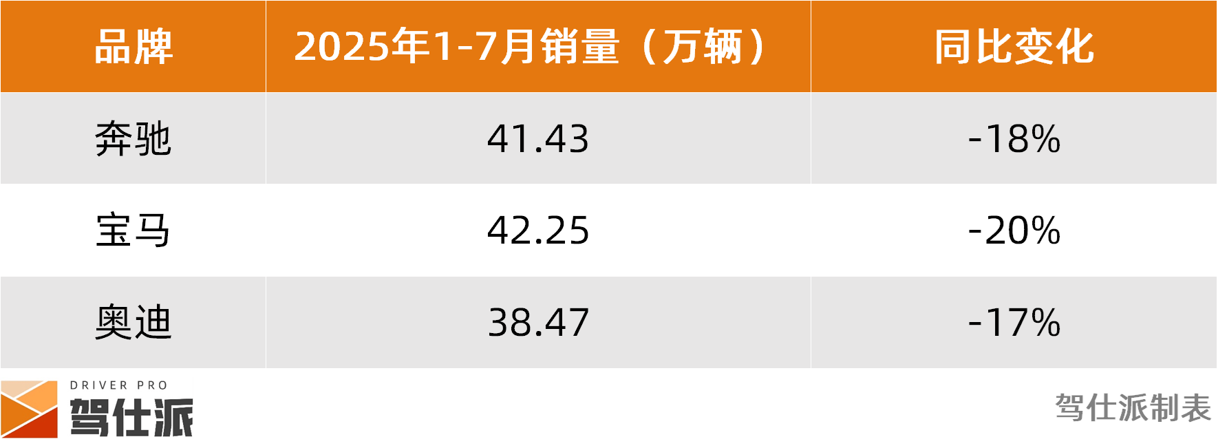 从最新数据来看,2025年1-7月,奔驰的销量为41.43万辆,同比下滑18%;宝马的销量为42.25万辆,同比下滑20%;奥迪销量为38.47万辆,同比下滑17%。