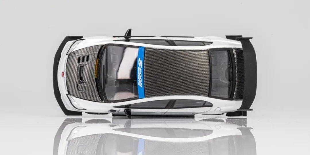 模型的漆面整体质感不错,前雨刮器是浮雕在前挡风上的,前挡风的前侧还有浮雕的格栅细节,做得很细腻,前挡上沿有蓝色spoon涂装;模型的内饰细节刻画也算到位,座椅为红色的桶式赛车座椅,安全带应该是贴纸的,而内饰细节则多为油漆刻画。