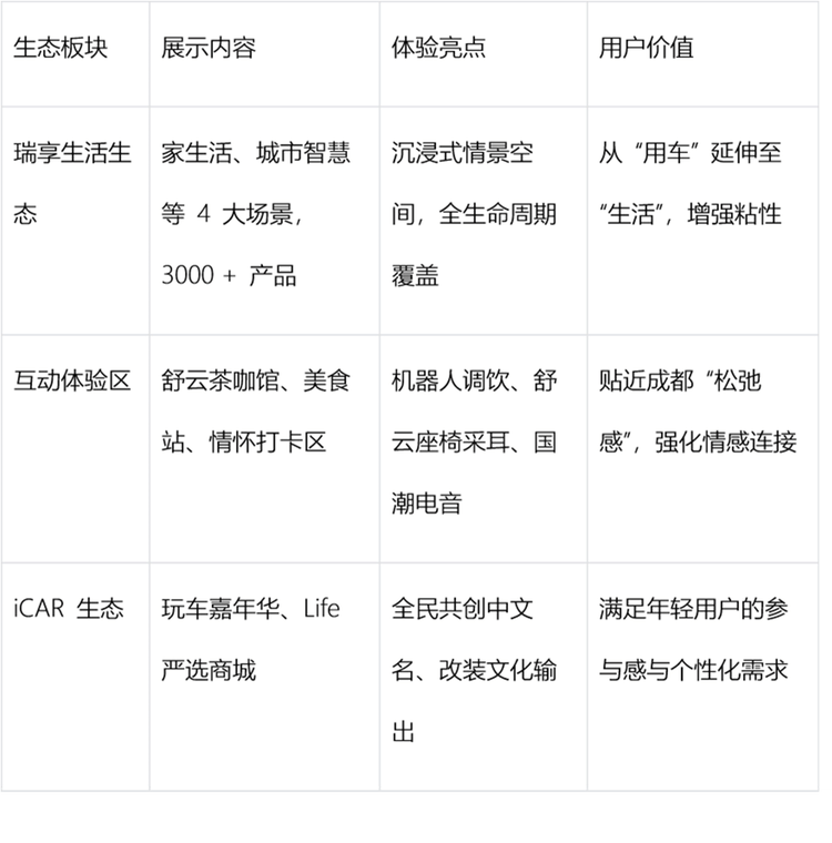 这种生态布局的优势显而易见:通过 “吃喝玩乐” 的场景化体验,让消费者感受到 “奇瑞不止是车企”。