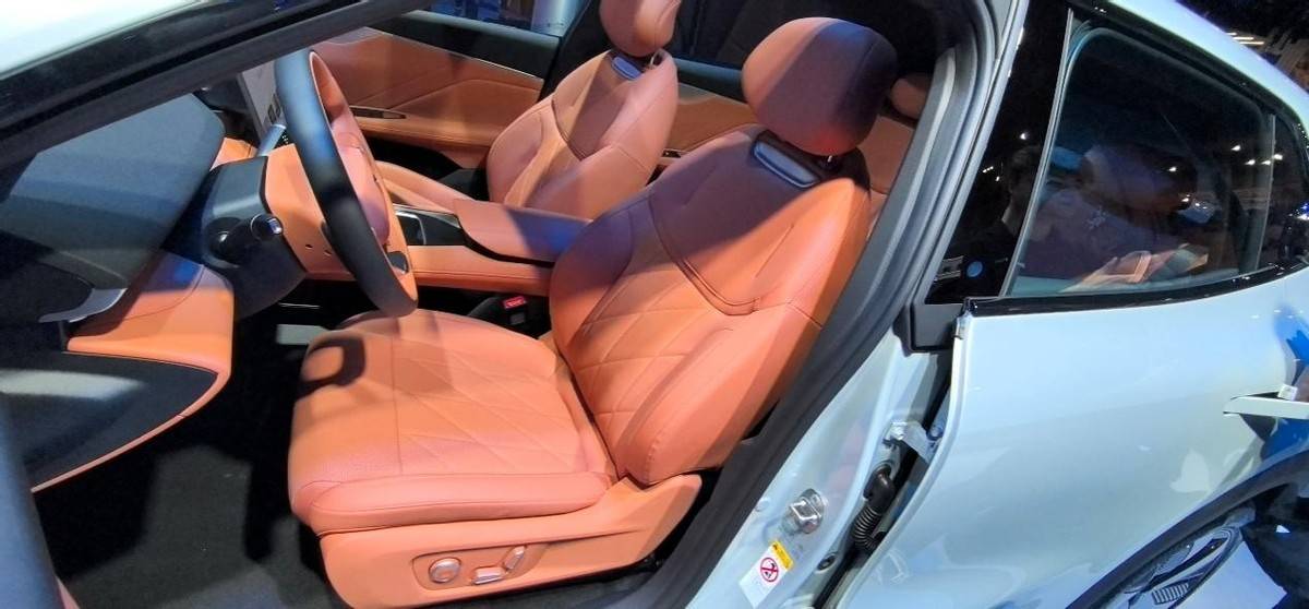 其次是在内饰方面,深蓝s05采用了环抱式座舱的设计,并且实拍车型也用到了橙色和黑色的混搭设计。其实环抱式座舱更强调豪华属性,而橙色又是很多豪华车的惯用车色,所以坐到车内的第一感觉就是整车有着不错的高级感体验,而这些都是得益于设计带来的产品体验。当然除了橙色和黑色的搭配之外,还有星岩灰 黄色缝线的内饰供用户选择,那个颜色则更倾向于营造运动氛围。
