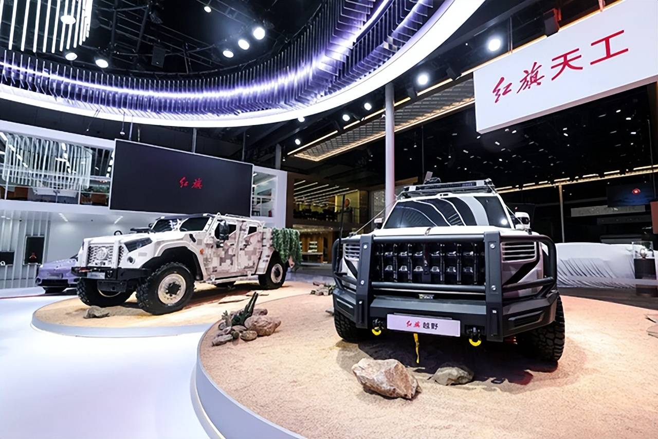 这次红旗特别做了军旅涂装,并且跟一汽的真军车放在一起,更加强化了这种感知。据了解,“红旗越野”军旅主题改装车传承一汽军工血脉与越野基因,兼具科技感与硬派风格。