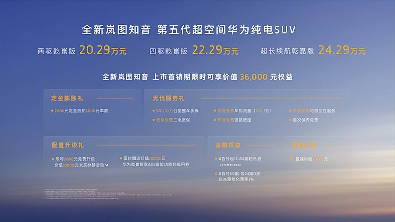 此次,全新岚图知音共推出三款配置车型,官方指导价区间为20.29万元至24.29万元,全系标配华为乾崑智驾ads 4与鸿蒙座舱harmonyspace 5。
