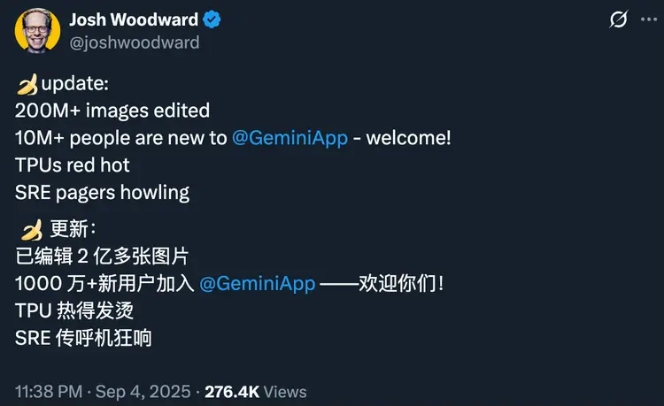 再加上几秒内生成的速度,整个过程的流畅感是前所未有的 。这也直接带动了 gemini app 的用户增长,在短时间内,nano banana为gemini app带来了超过1000万新用户。