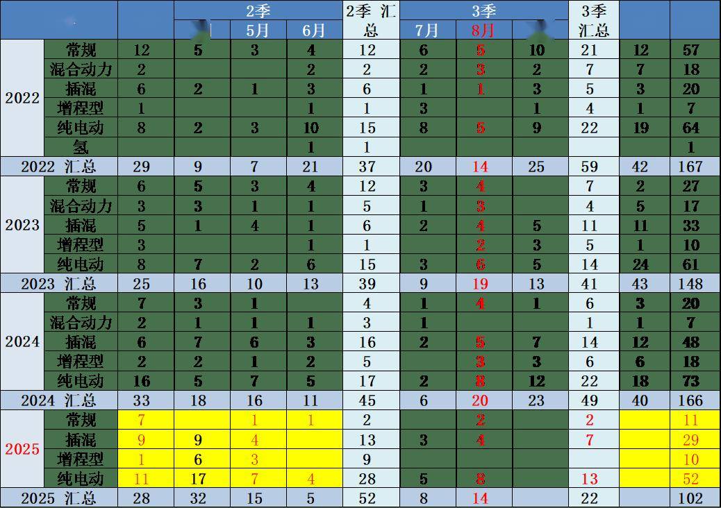 今年8月按动力拆分的新车达到14款,较去年8月的20款较少。今年8月纯电动新车8款,插混有4款,增程式也没有新品,燃油车新品仅有2款推出,这是行业发展巨大的隐忧。这些新车有些是新车型,有些是改款改名字的新车型,更多的是新能源车型。近两年的汽油车的数量较前期明显减少,尤其是今年没有混合动力新车推出。