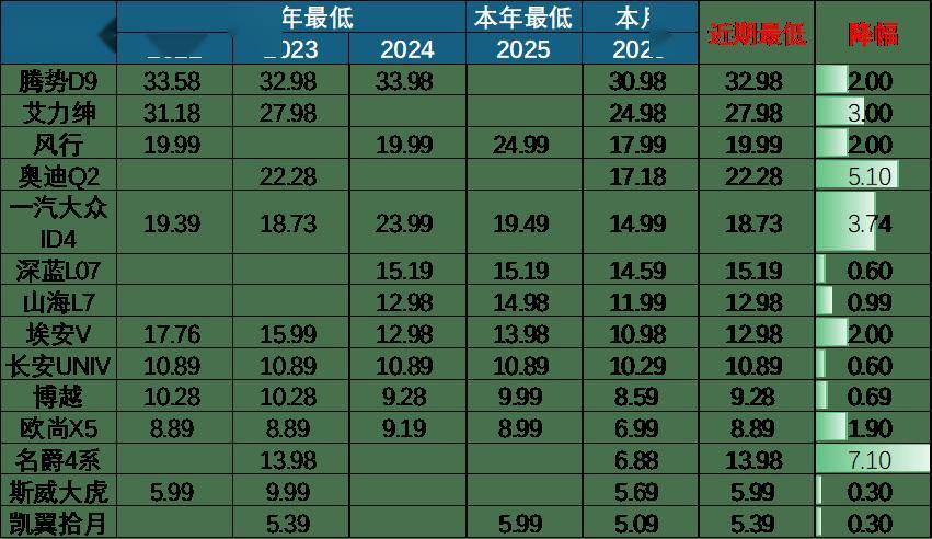今年的新品不多,价格表现也一般。燃油车新品推出的最低价格没有突破2024年价格底线。新能源车品牌的主力高端品牌实现产品线的扩张下移,比亚迪和大众品牌的产品丰富较快,新车的价格也有下移,这对增量的效果应该很好。