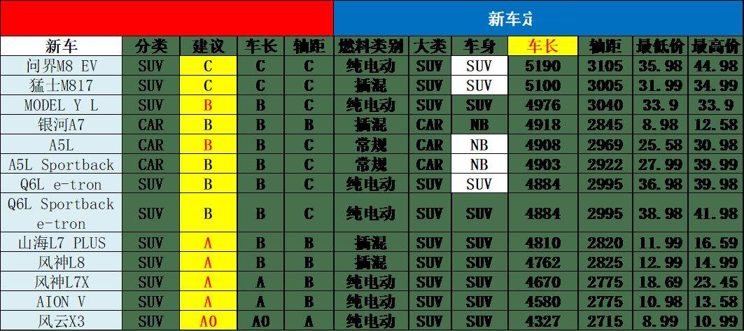 近期乘用车市场的传统车市场推出新车型逐步放缓,新能源大幅增加新品投放。目前主力车企产品逐步进入多生孩子好竞争的局面,车企呈现剧烈的价格竞争和破圈趋势。这些传统车和新能源车的新车型如何归类也是很重要的,每家都有自己的分级模式,但我们还是习惯用行业相对主流的源自于德国大众的a00、a0、a、b、c、d分级模式作为基础,成为行业参照的公用分级方式。对这个行业分级,测算本月新车的分级如下,具体的调整也是仅供讨论。如有不同观点也可留言。