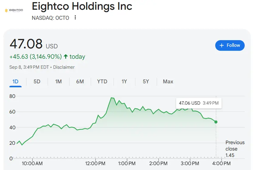 一系列消息刺激eightco股价在周一盘中暴涨近5000%,一度推动其市值增至2.1亿美元。据彭博数据显示,其股票成交量约为20日平均水平的5.4万倍。