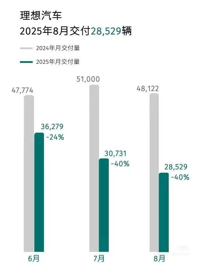 这已经不是理想今年第一次出现销量大幅下滑的情况,今年7月份,理想汽车卖出了3万辆,相比去年5.1万辆的成绩,也出现了大约40%的同比下滑。
