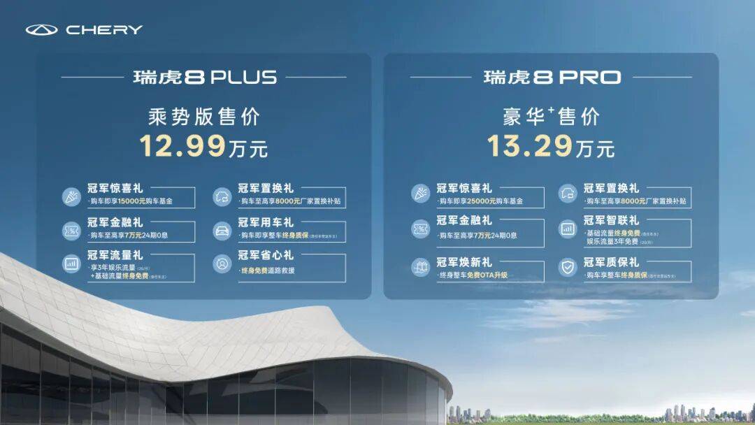 作为受到全球用户喜爱的现象级suv,瑞虎冠军家族始终坚持以用户为中心,致力于满足多元化用车需求,不断更新迭代,为用户创造更多价值。2025年9月10日,瑞虎8 plus及瑞虎8 pro迎来全新版型。其中瑞虎8 plus乘势版售价12.99万,瑞虎8 pro豪华 售价13.29万。