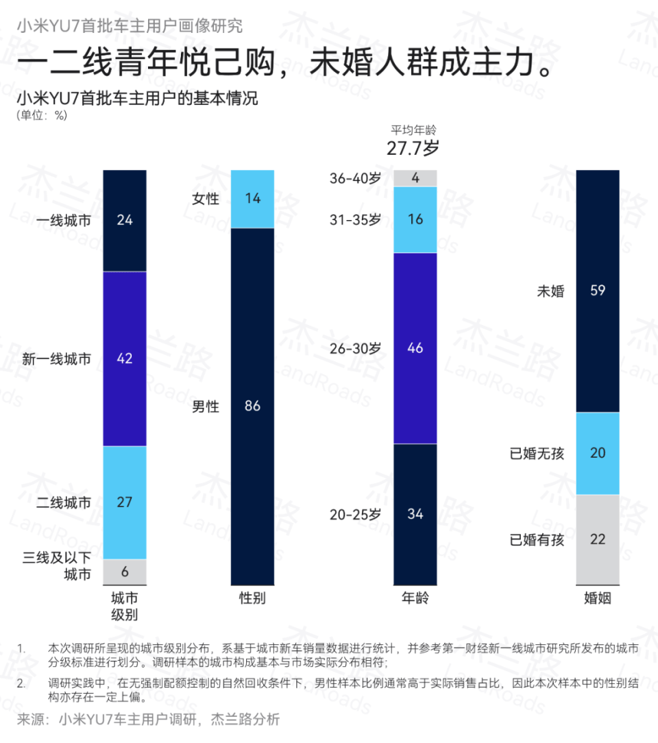日前,国内知名咨询机构杰兰路发布了小米yu7的首批车主画像,整个内容非常详尽,大家可以搜索《小米yu7首批车主用户画像研究:又一次的“年轻人的第一台车”》查看全文,我们摘取了其中一些比较有代表性,却可能存在争议的数据,为大家进行分析一下,让小伙伴们也看一看,到底是谁买走了小米yu7,或者说,谁“抢订”小米yu7像抢白菜一样……